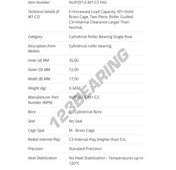 The Roller Bearing, known as NUP207-E-M1-C3-FAG FAG, has an inner diameter of 35 mm, an outer diameter of 72 mm and a thickness of 17 mm.