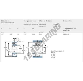The Self Aligning Roller Bearing, known as 22213-E-SKF SKF, has an inner diameter of 65 mm, an outer diameter of 120 mm and a thickness of 31 mm.