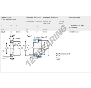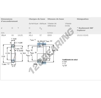 The Tapered Roller Bearing, known as 15101-15245-SKF SKF, has an inner diameter of 25.4 mm, an outer diameter of 62 mm and a thickness of 20.638 mm.