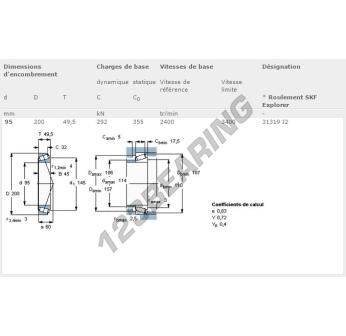 The Tapered Roller Bearing, known as 31319-J2-SKF SKF, has an inner diameter of 95 mm, an outer diameter of 200 mm and a thickness of 49.5 mm.