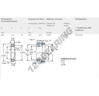The Tapered Roller Bearing, known as 33113-SKF SKF, has an inner diameter of 65 mm, an outer diameter of 110 mm and a thickness of 34 mm.
