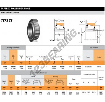 The Tapered Roller Bearing, known as EE129120X-129172-TIMKEN TIMKEN, has an inner diameter of 304.8 mm, an outer diameter of 438.048 mm and a thickness of 76.2 mm.
