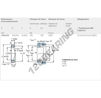 The Tapered Roller Bearing, known as LM241147-LM241110-VQ051-SKF SKF, has an inner diameter of 200.025 mm, an outer diameter of 276.225 mm and a thickness of 46.038 mm.