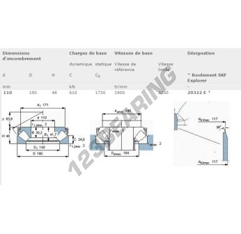The Thrust Roller Bearing, known as 29322-E-SKF SKF, has an inner diameter of 110 mm, an outer diameter of 190 mm and a thickness of 48 mm.