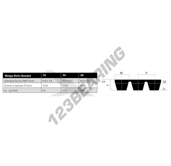 The 3-3V1250 belt of the Multi-strand V-belt family, by brand Generic, and in 3V profile. It has a 9.65mm x 7.8mm section with a mm internal length, a mm external length, and a mm primitive length.