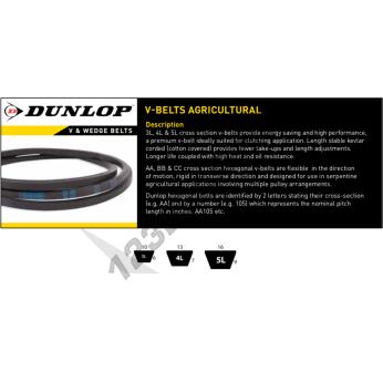 The 4L350K-DUNLOP belt of the V-belt Wrapped family, by brand DUNLOP, and in 4L profile. It has a 12.70mm x 9mm section with a 839 mm internal length, a 889 mm external length, and a mm primitive length.